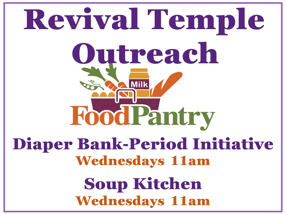 Revival Temple Outreach Ministries serve the community through the Food Pantry, Soup Kitchen and Diaper Bank, all held weekly, while supplies last. Check our calendar for dates & times of all services.